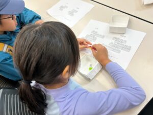 航空宇宙研究のサークルでは、宇宙飛行士が実際に行うトレーニングを体験できるコーナーがあり、平面に描かれたブロックを立体で再現する課題に挑戦していました。